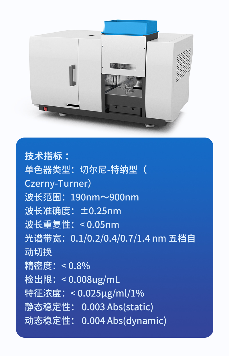 元素燈和氘燈雙重切換和背景扣除,具備氘燈與自吸收兩種背景校正模式,背景信號 1A 時,扣背景能力 50 倍以上。