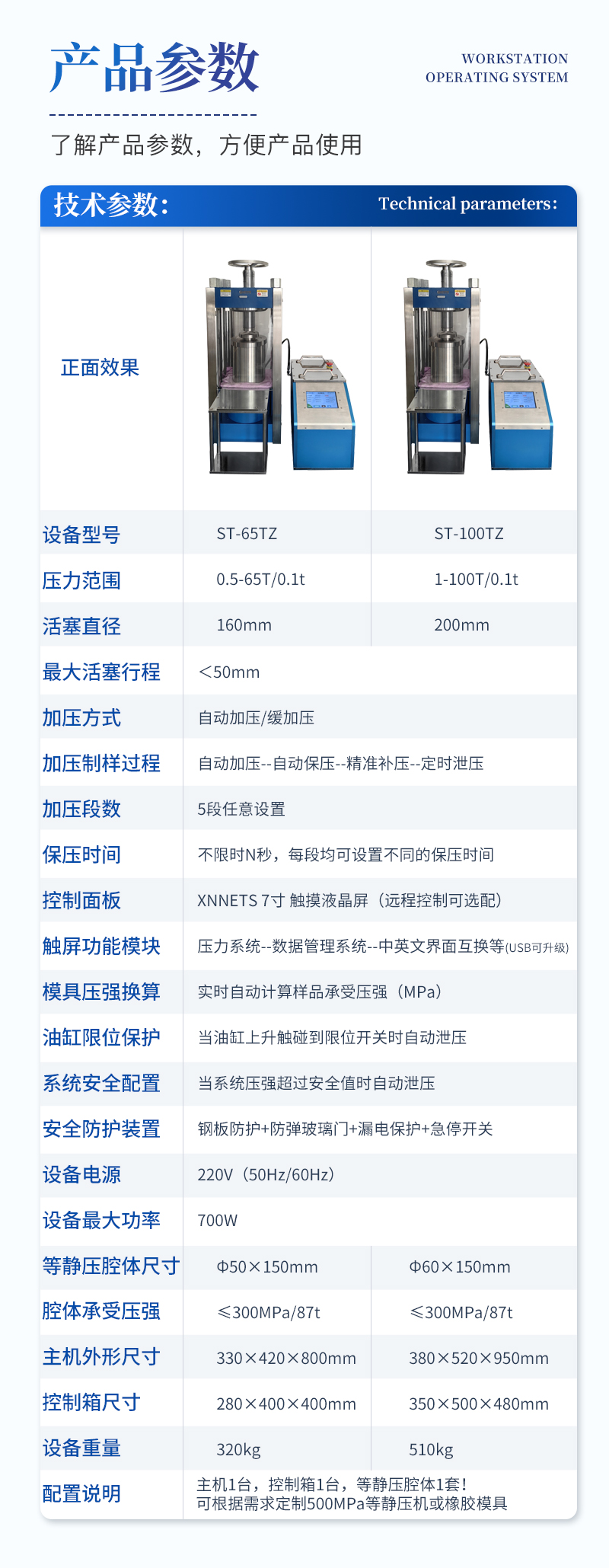 | 配置說明 | 主機1臺,控制箱1臺,等靜壓腔體1套!可根據需求定制500MPa等靜壓機或橡膠模具 |